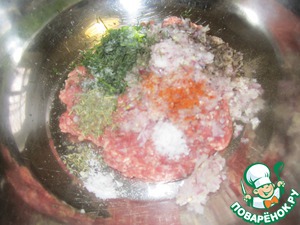 Потом смешиваем фарш, мелко нарезанный лук, укроп, базилик и специи. -