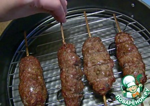 Формируем мокрыми руками из фарша колбаски и нанизываем на деревянный шампур.