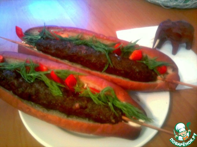 Люля-кебаб - это мясной фарш, нанизанный на шампур и зажаренный на мангале. Существует много рецептов этого блюда и без мангала, я готовлю люля-кебаб так...
