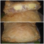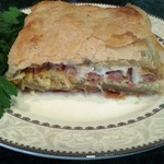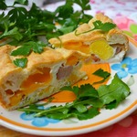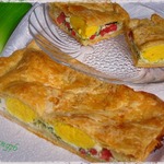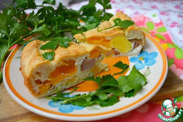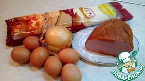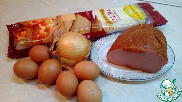 Состав продуктов: 6 яиц, большая луковица, ветчина - 200гр, тесто 500-600гр.