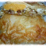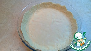 Аккуратно кладем тесто сверху. Прокалываем вилкой тесто так, чтобы не попасть на желток. Внимание!!! не прокалывать по желтку.
