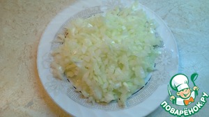 Сверху лука, выкладываем нарезанную кубиками ветчину.