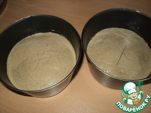 • Когда тесто значительно увеличилось в объёме, выкладываем его в форму для хлеба, которую предварительно смазываем маслом. Т. к. тесто липкое, поверхность его выравниваем ложкой, смоченной водой. Делаем сверху небольшие надрезы и даём тесту подняться в форме.