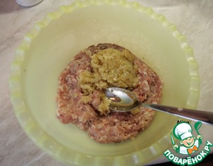 Когда наши омлеты уже пожарены, мы начинаем заниматься фаршем. В готовый куриный фарш нужно добавить луковицу, мелко порезанную и пожаренную до золотистого цвета, а так же посолить, поперчить по вкусу и все это перемешать.