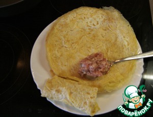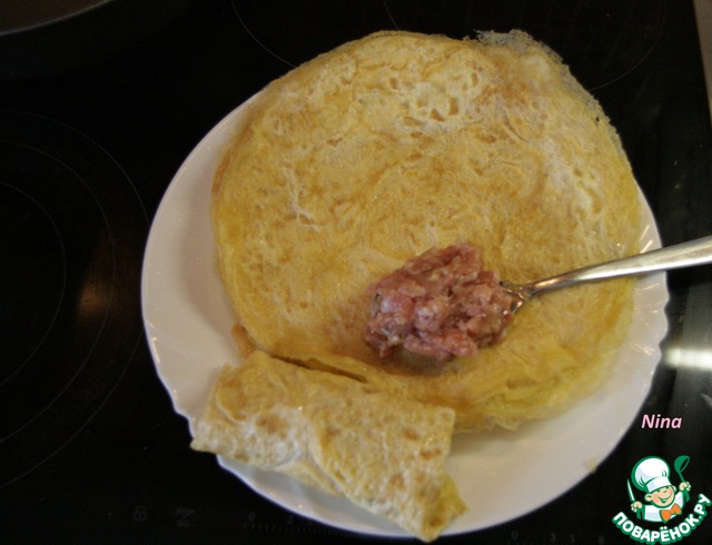 10 яиц, 10 ч. л. воды, 10 ч. л. растительного масла, взбить вилкой, посолить по вкусу и выпечь из этой смеси 12 блинчиков (омлетов).