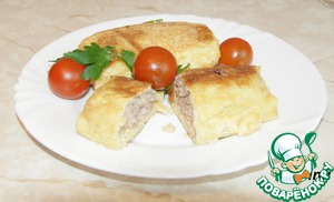 После того как фарш перемешали, делаем конвертики из блинчиков и куриного фарша. В один конвертик я положила по 1 ст. л. фарша.