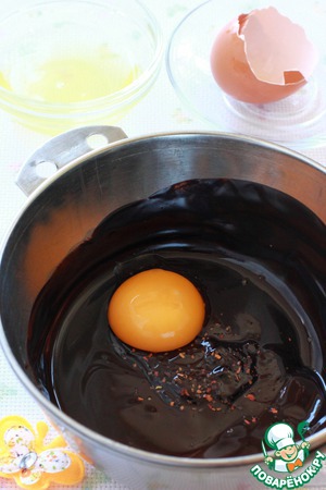 Когда шоколадные шарики хорошо замерзнут, начинаем готовить шоколадный мусс. В оставшийся, уже остывший (но все еще мягкий) шоколад всыпаем щепотку чили (не бойтесь, остро не будет!) и добавляем желтки. Взбиваем миксером на большой скорости - масса посветлеет, станет воздушной, более нежной и пушистой.