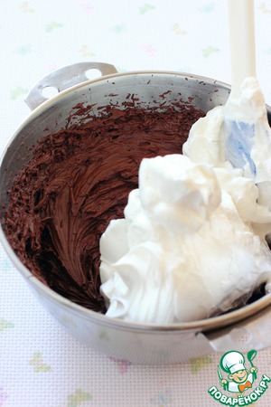 Отдельно взбиваем холодные белки со щепоткой соли, добавляя постепенно мелкий сахар или сахарную пудру - до устойчивых пиков. Частями ввести белки в основную шоколадную массу и перемешать шпателем складывающими движениями, стараясь сохранить муссовую, воздушную структуру.