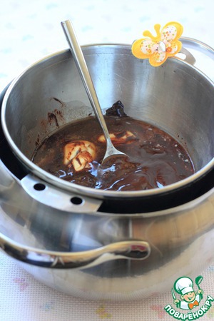 Шоколад поломать на мелкие кусочки, добавить сливочное масло и растопить на водяной бане. Дно посуды не должно касаться воды. Хорошо перемешать.