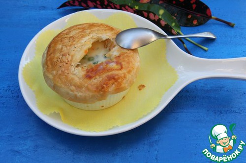 Из слоеного теста вырезать круги, диаметром на 2 см больше, чем ваши формы-горшочки. Это удобно сделать приложив саму форму-горшочек.