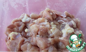 Я всегда использую в этом рецепте именно темное мясо курицы. Думаю, все со мной согласятся, в пирогах это наилучший вариант! Итак, отделяем мясо от кости. Нарезаем на мелкие кусочки, а из косточек варим бульон (нам нужно всего 300 мл нежирного бульона).