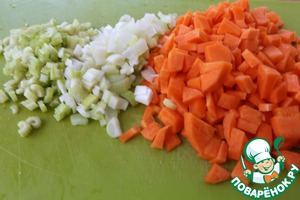 Добавить мелко нарезанный лук, морковь и сельдерей и тушить их в течение 5 - 7 минут.