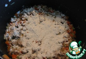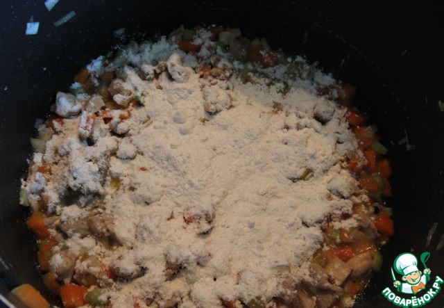 Добавить муку и перемешать все вместе, не больше минуты, до образования липкой массы. Вливаем куриный бульон, тем, кто любит, мелко рубленый тимьян. Доводим все до кипения, оставляем на мелком огне на 10-15 минут. (Я удалила случайно фото уже с бульоном, так что здесь шаг с добавлением муки)