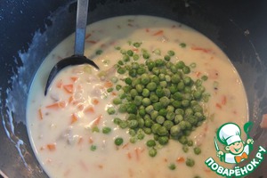 Теперь вливаем сливки и горох. Все приправить солью и перцем по вкусу. Тушим на медленном огне еще около 10 минут. В это время разогреваем духовку до 180 С.