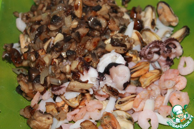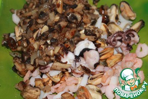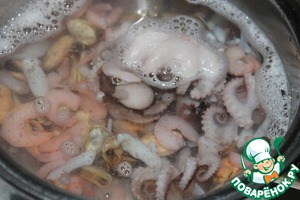 Морской коктейль всыпаем в подсоленую кипящую воду на 3 минуты и откидываем на дуршлаг