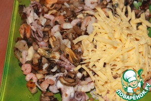 Сыр натираем на терке и подмешиваем к остальным ингредиентам