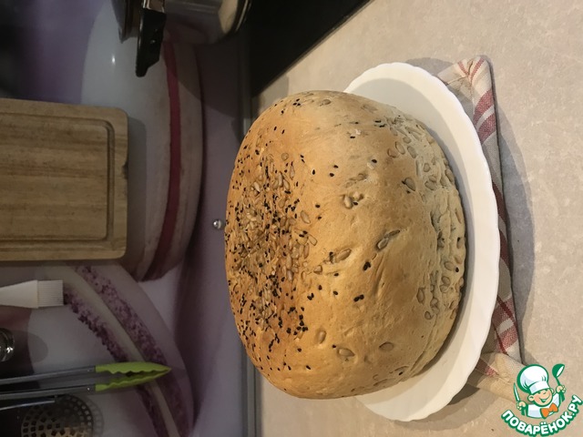 После расстойки тесто снова мнем и формируем из него шар, кладем в смазанную чашу мультиварки, включаем подогрев на 10 - 15 минут, затем мультиварку отключаем и даем хлебушку подняться 40 - 50 минут. Выпекаем хлеб в мультиварке в режиме "выпечка" 60 минут с одной стороны.