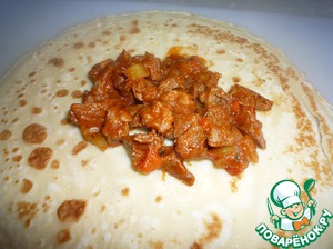 На середину блина кладем мясо (около 2 ст. л.).