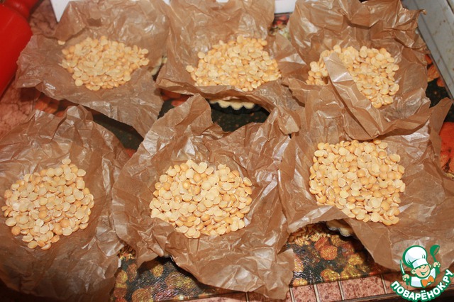 На тесто укладываем бумагу для запекания и насыпаем бобовые, чтоб при выпечке наши горшочки не вздулись.