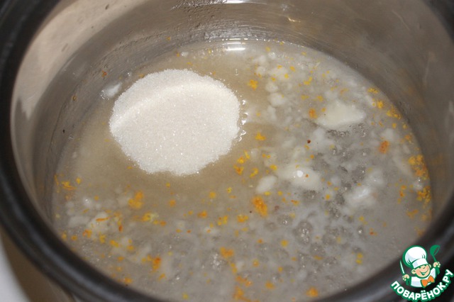 Нагреваем 130 мл воды, добавляем 50г сахара, 0.5 стручка ванили, апельсиновую цедру, доводим до кипения, чуть охлаждаем, добавляем набухший желатин, лимонный сок 2 ст. ложки и пару листиков мяты нарезанной. Охлаждаем, процеживаем -