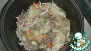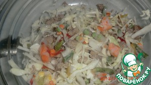 Капусту нашинковать и перемешать с мясным фаршем и овощами.