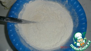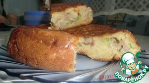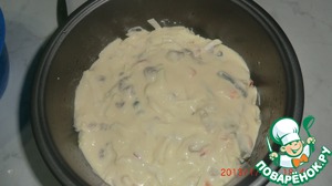 3 яйца взбить, добавить 5 ст. ложек сметаны, 3 ст. ложки майонеза, 6 ст. ложек муки, 1 ч. ложку соли, 2 ч. ложки разрыхлителя. Замесить тесто.