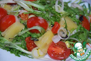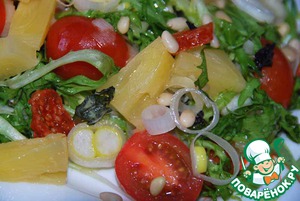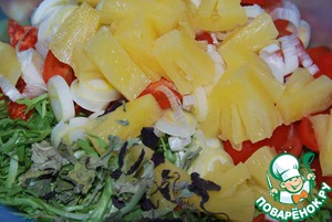 Смешать все овощи с салатом, добавить нарезанный консервированный ананас и мелконарезанный базилик (я использовала сушёный, присланный Галочкой-mamaliza).