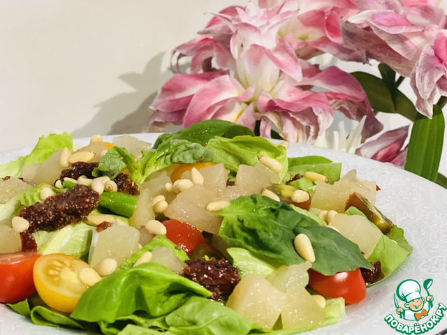 Сегодня, прямо в канун 8 марта, я получила бандерольку с подарками от Танечки - LaCostena, среди множества приятных вещиц я сразу увидела книжку "Рецепты вкусных блюд" из зелени и салатов. Пролистала и тут же сделала этот салатик. Думаю, что он придётся по вкусу тем, кто хочет сбросить лишний вес, набранный за зиму, ведь в нём всего 41,5 ккал на 100 гр готового продукта, а кроме того, он пикантен, вкусен и полезен.