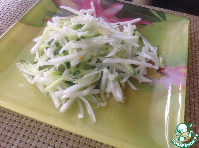 Затем натереть на терке для моркови по-корейски огурец и дайкон, выделившийся при этом сок слить. Если нет такой терки, то овощи можно просто нарезать тонкими брусочками при помощи ножа, тогда и сока будет намного меньше. Чеснок почистить и нарезать небольшими кусочками с красным перцем. Ориентируйтесь на свой вкус, хотите, чтобы было поострее, нарежьте больше перца, но не забывайте, что в салат будет добавляться еще и имбирь. Дайкон и огурец соединить в одной тарелке, посолить (если вы не будете добавлять соевый соус, то солите сразу как надо, а если будете, учитывайте, что соус тоже соленый), сбрызнуть соком лимона. Тем временем на сковороде разогреть оливковое масло, добавить туда чеснок, имбирь и перец, немного прогреть, минутки 3.