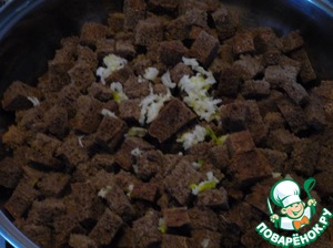 На сковороде подогреть 40 г масла и положить нарезанный кубиками (примерно 1 х 1 см) хлеб и пропущенный через пресс чеснок. Сушить на очень маленьком огне 7-10 мин.