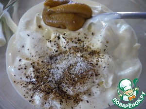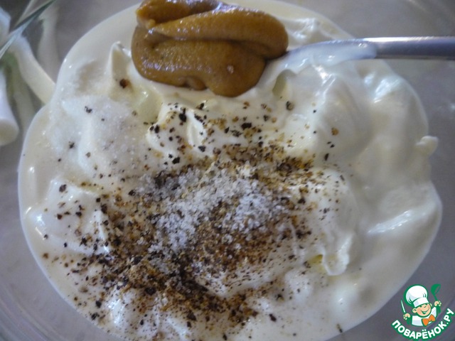 Сметану смешать с горчицей, перцем и солью.