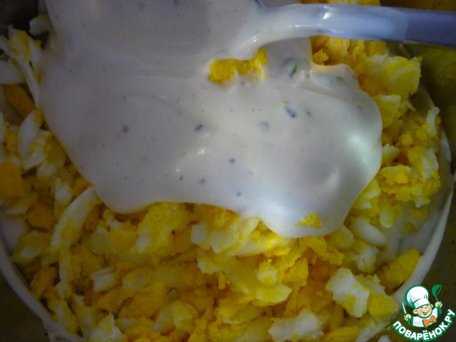 Слой натертого на крупной терке яйца и весь соус. Смазываем, утрамбовываем и на 30 мин. ставим в холодильник. Немного желтка оставить для украшения.