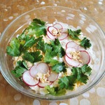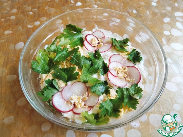 На тарелку, в которой будете подавать салат, поставить кольцо (у меня диаметр 10-11 см, из банки из под кофе). На дно выкладываем натертую или нарезанную соломкой редиску, хорошо утрамбовываем и смазываем вышеприготовленным соусом. 2-3 редиски оставим для украшения.
