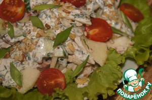 Мясо курицы разделить на кусочки по волокнам и добавить в общую массу. Туда же бросить орехи (пару щепоток оставить). Все аккуратно перемешать.