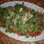 Очень захотелось какого-нибудь легонького салатика. От итальянского свадебного супа осталась вареная курочка, а в холодильнике нашлись сельдерей, зеленое яблоко, огурцы и помидоры... вот и получился легкий, освежающий салатик.