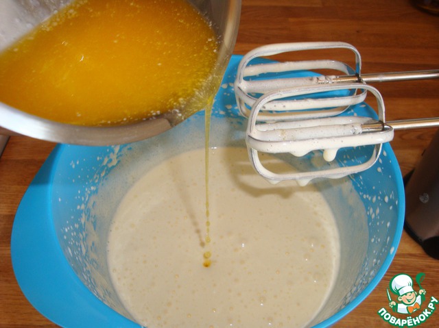 Взбиваем яйца с сахаром добела и подливаем к ним растопленное масло. Перемешиваем как следует.