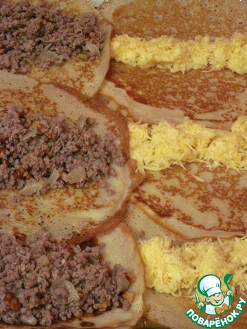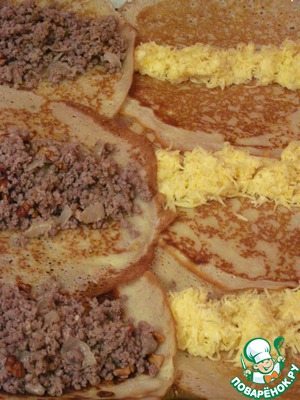 • Уложить блины в шахматном порядке, чередуя начинки. Это нижний ряд.