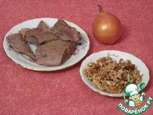 • Лук мелко нарезать и обжарить. Мясо перекрутить через мясорубку. Грецкие орехи мелко порубить. Добавить половину нормы майонеза, соль по вкусу и тщательно перемешать.