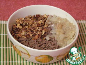 Лук мелко нарезать и обжарить. Мясо перекрутить через мясорубку. Грецкие орехи мелко порубить. Добавить половину нормы майонеза, соль по вкусу и тщательно перемешать.