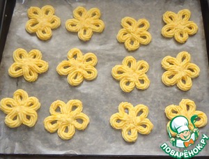 Противень застелить пекарской бумагой и смазать растительным маслом. Тесто выложить в виде цветочков с помощью кондитерского шприца с насадкой в виде звездочки.