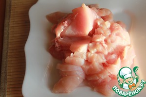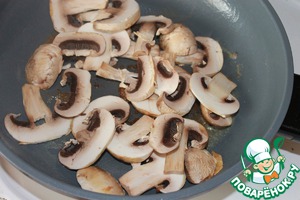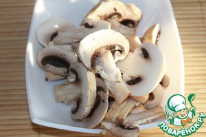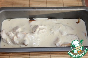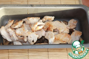 В форму выкладываем слоями: шампиньоны, сверху обжаренную куриную грудку