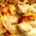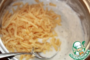 Муку смешиваем со сливками, чесноком, перцем, варим соус до загустения и добавляем тертый мягкий сыр (у меня гауда), размешиваем до расстворения сыра, добавляем оставшееся белое вино, хорошо размешиваем