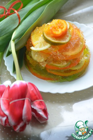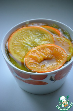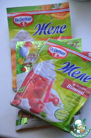 Развести фруктовое желе по инструкции. Я использовала по 0,5 пачки апельсинового и желе из крыжовника. Фруктовое желе можно заменить обычным желатином+сок (апельсин, тархун) или использовать сироп, в котором кипели фрукты (вода, сахар и сок с фруктов)