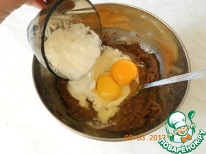Добавить натуральный йогурт без вкусовых добавок или любой другой кисломолочный продукт и разбить яйца. Перемешать.
