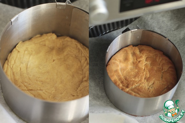 • Выложить его в форму. У меня кольцо стоит на 16см. При помощи лопаточки сделайте тесто полукруглым сверху и отправьте в разогретую до 180 градусов духовку на 25-30 минут.