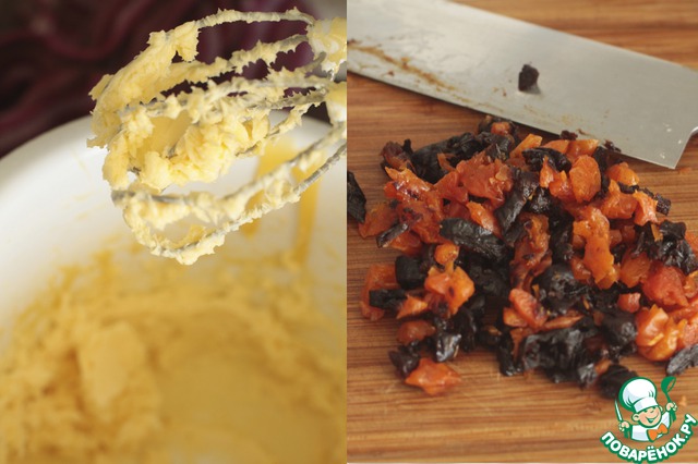 • Для крема нужно взбить сливочное масло с медом и миндальным ароматизатором. Мелко нарезать курагу и чернослив. Если курага у вас сухая, то предварительно замочите ее перед приготовлением.