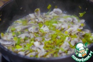 Лук порезать и вместе с шампиньонами припустить на сковородке на растительном масле 7-10 минут.