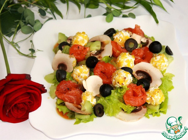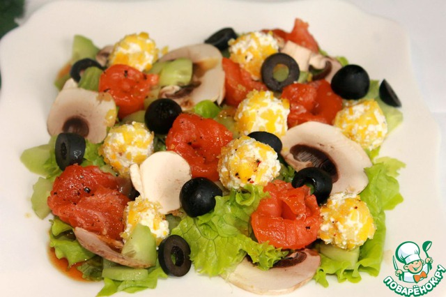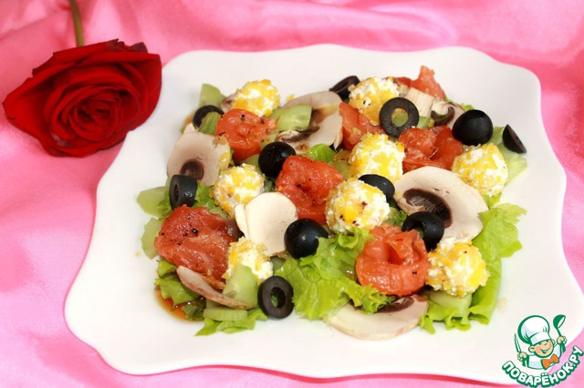 Собираем наш салатик: на плоскую тарелку выкладываем порванный салат, поливаем половиной соуса, затем выкладываем огурчики, тоненько нарезанные шампиньоны, оливки, разрезанные на 3 части, полосочки семги, свернутые розочками, и творожные шарики, и поливаем остальным соусом