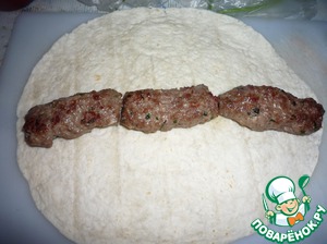 Котлетки положить на лаваш, свернуть рулет. Затем рулет порезать на кусочки (около 3 см.).