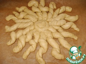 Теперь каждый кусочек теста сворачивайте в жгут и немного перекручивайте. И прилепляйте к центру - это будут лучики солнца.